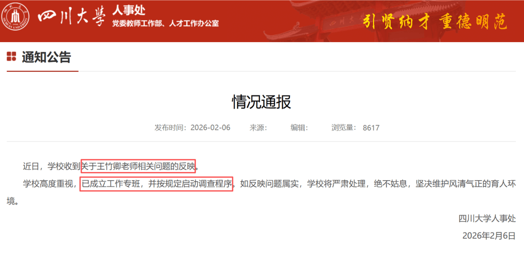 2026年2月6日,四川大学发布环境传递:学校高度注沉,已成立工做专班,如反映问题失实,学校将庄重处置,毫不姑息,风清气正的育人。