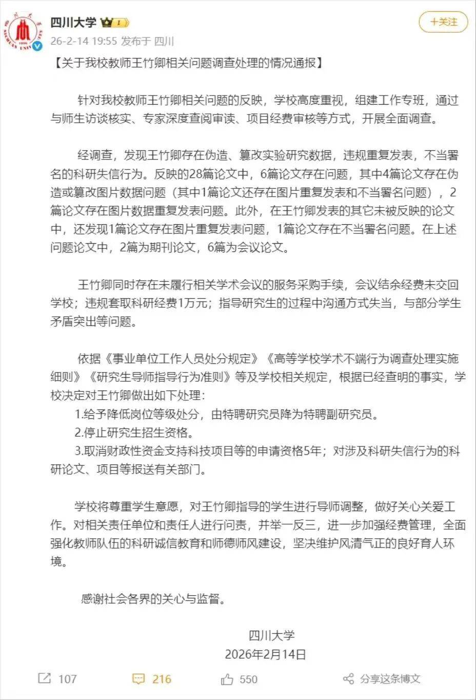 2026年2月14日,四川大学发布《关于我校教师王竹卿相关问题查询拜访处置的环境传递》,发觉王竹卿存正在伪制、尝试研究数据,违规反复颁发,不妥签名的科研失信行为,由特聘研究员降为特聘副研究员。遏制研究生招生资历。