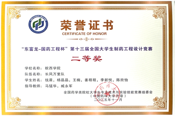 近日,正在第十三届“东富龙-国药工程杯”全国大学生制药工程设想竞赛中,荣获全国二等1项、三等2项。