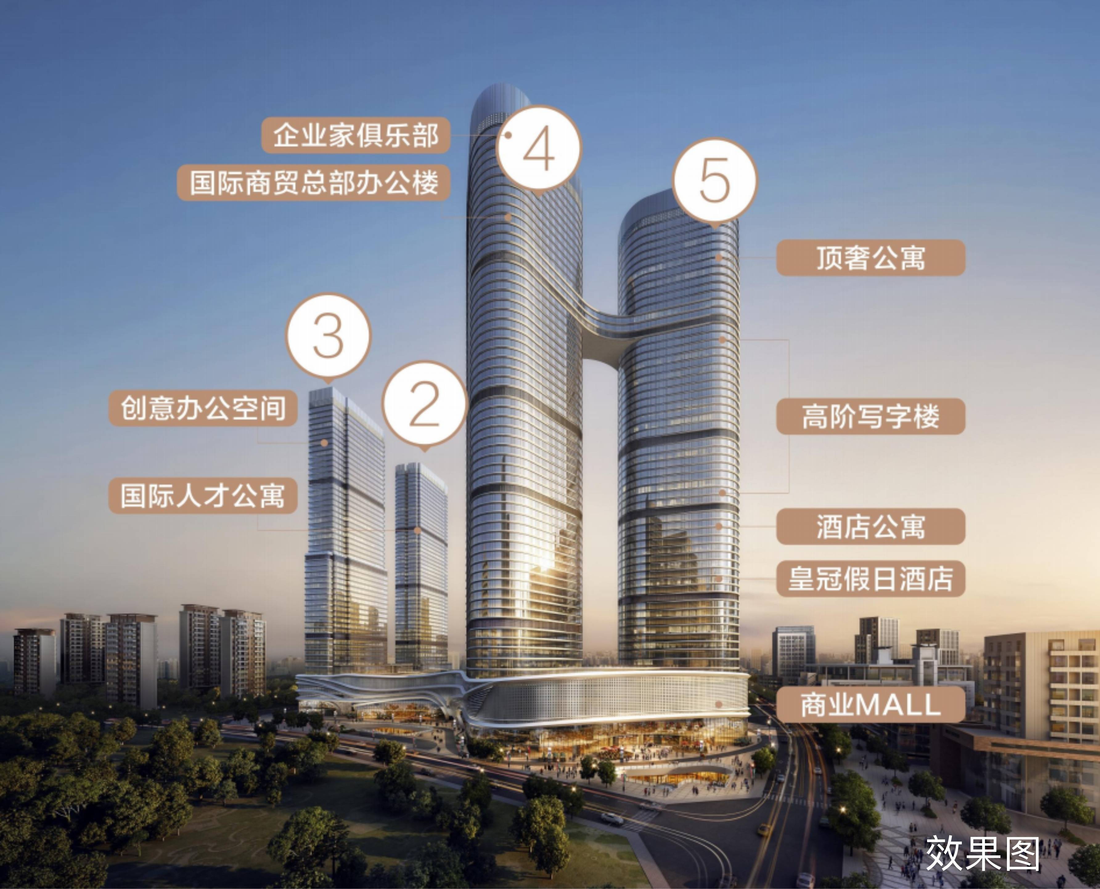 项目配套:约10万㎡自持运营贸易mall、云端CLUB、皇冠假日酒店、约8000m城市功能空间、三沉入户系统、高定管家办事。