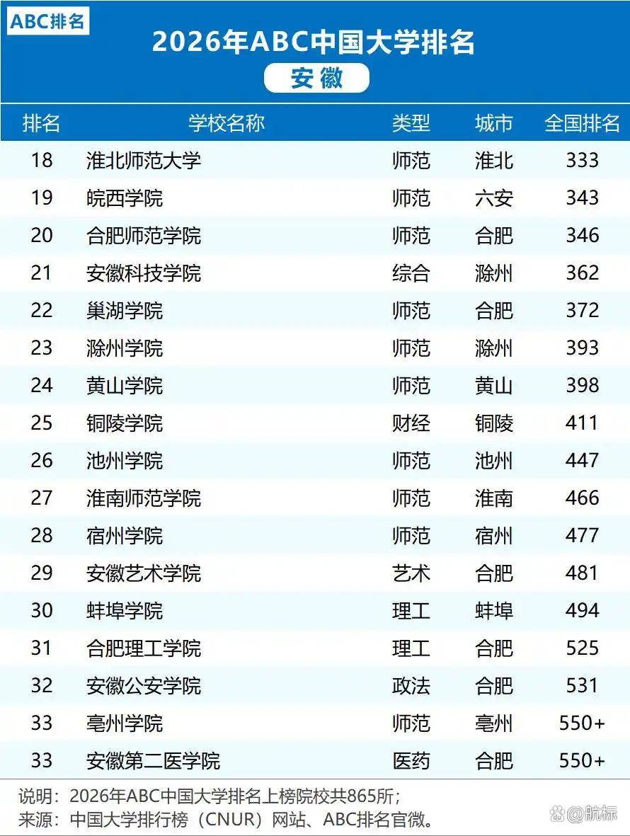 1 月 5 日,中国大学排行榜(CNUR)官网结合 ABC 排名官微放出 2026 年 ABC 中国大学排名 —— 全国 1241 所本科院校上榜的大名单里,安徽 33 所公办本科的表示,藏着当地高教 “分层突围” 的新逻辑。