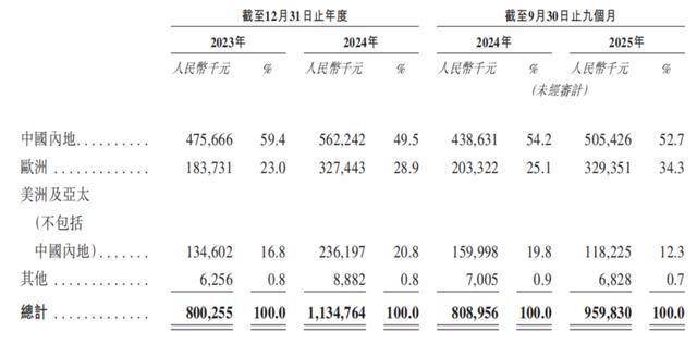 国内市场为浙江荣泰贡献超一半的收入,公司产物还销往欧洲、美洲、亚太及其他地域。此中,来自欧洲市场的收入增速迅猛,2024年及2025年前9个月,该增速达到78。22%、61。98%,跨越公司总收入增速,同时,欧洲市场收入占比也由期初的23%增至期末的34。3%。