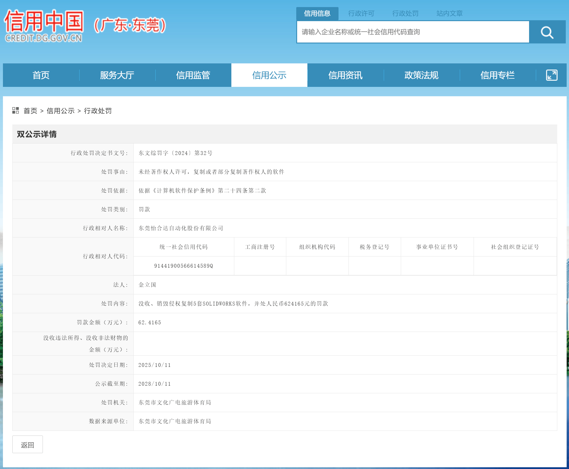 近日,南都记者从信用中国(广东东莞)获悉一则行政惩罚消息,东莞怡合达从动化股份无限公司(下称“怡合达”)因未经著做权人许可,被东莞市文化广电旅逛体育局、侵权复制5套SOLIDWORKS软件,