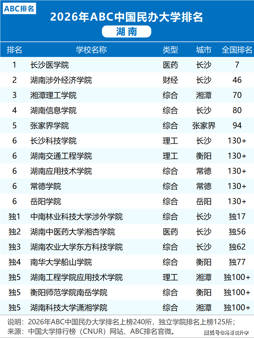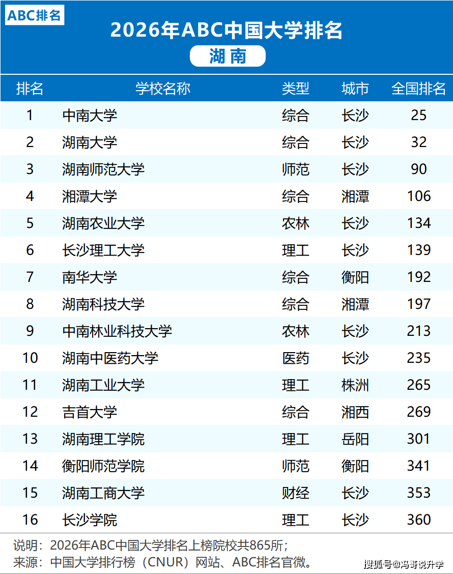 几家欢喜几家愁!湖南做为教育强省,高校排名历来备受关心。2026年ABC机构发布的中国大学排行榜一出炉,就惊掉了不少人的下巴。